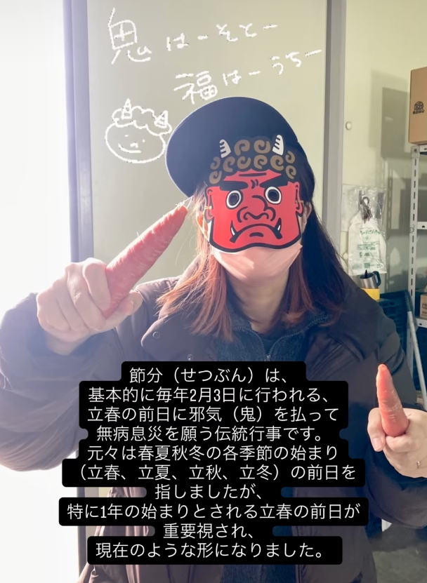 そんななか2月3日、弊社でも節分の豆まきを行いました。「福は内~、鬼は外~」と言って、鬼に扮した邪気を払いました。