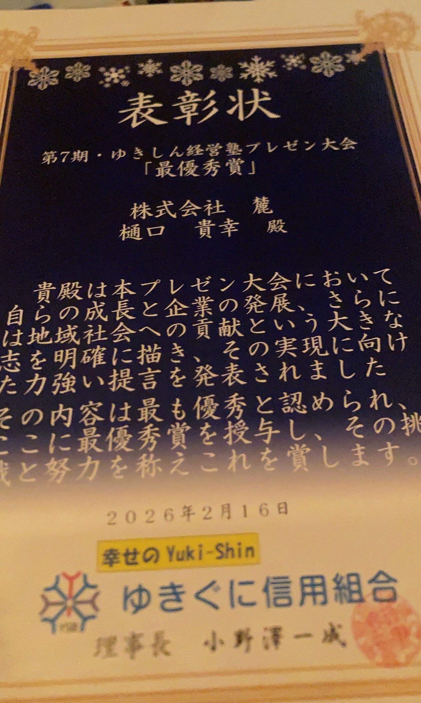 南魚沼市、湯沢町、十日町市、津南町から50社ほどが参加しての勉強会でした。課題の一つでプレゼン大会が開催され恥ずかしながら最優秀賞をいただきました。